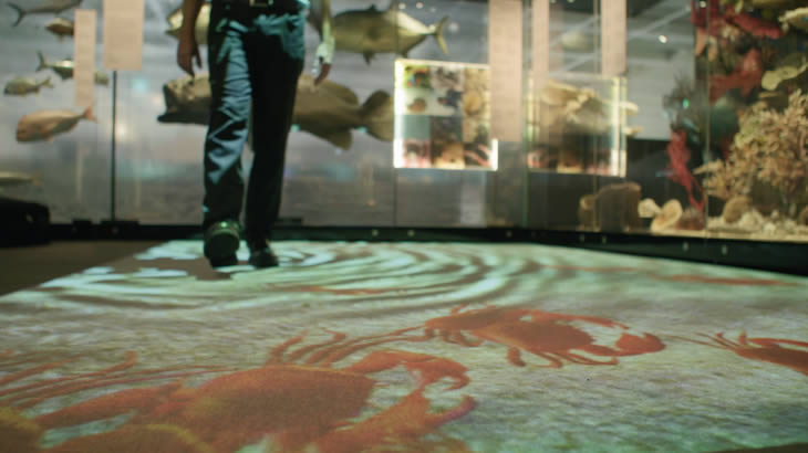 This is the interactive part where you’ll find all the kids congregating because we’ve got some crabs on the floor with a water effect, and we’ve got a Hitachi projector and it’s mirroring onto the floor. The program is set up so that the kids can come around and ripple the water and touch the crabs, and the crabs will move away.